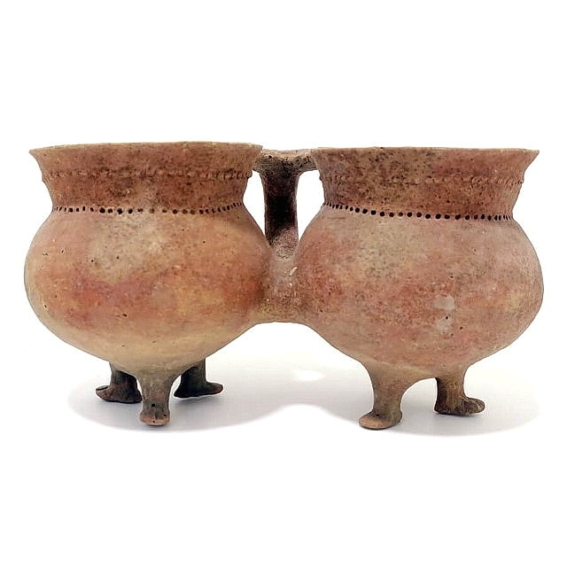 A twin-jar, connected and having a common handle, on 6 “legs” (3 at each jar). Bab-edh-Dhra style. The Early Bronze Age 1
