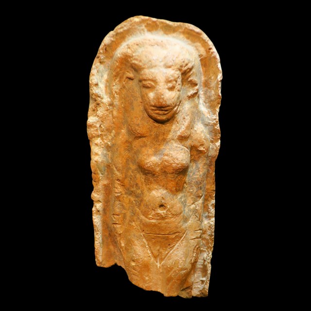 צלמית-לוחית של אשה עירומה שוכבת, כששתי ידיה מתוחות בצמוד לגוף. הלוחית נוצרה בתבנית. תקופת הברונזה המאוחרת