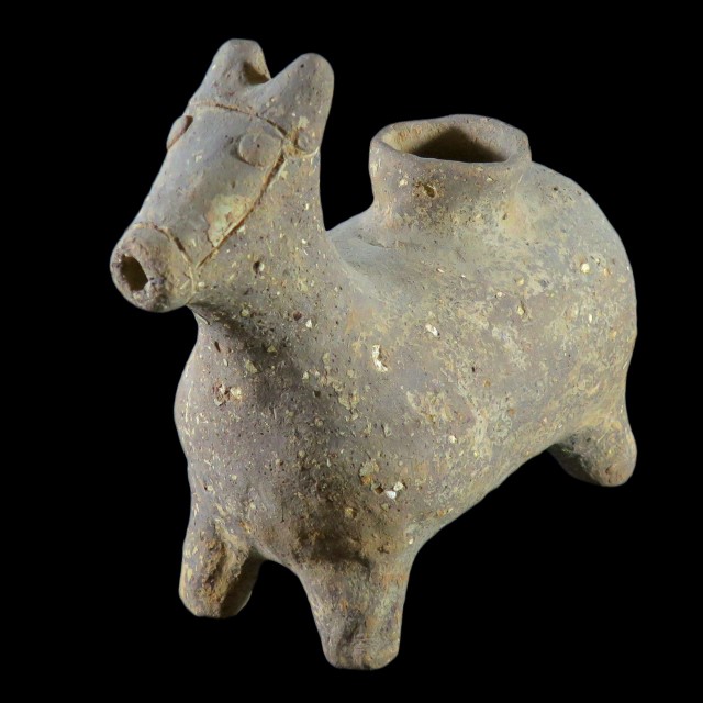 A zoomorphic vessel in the shape of a horse, carrying a jar. Iron Age 2
