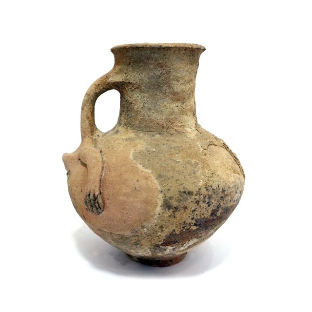 פך, כנראה פולחני, עם פני אדם סכמטיים מתחת לידית ו-2 ידיים מצידי הראש (כלי אנתרופומורפי). תקופת הברזל 1