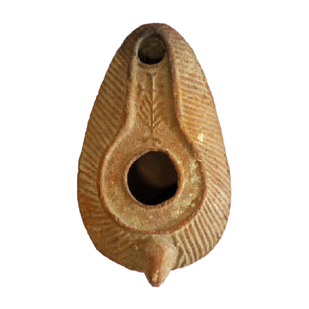 An oil lamp with a cross growing from a symbolic Menorah (in the shape of a plant). The Byzantine period.