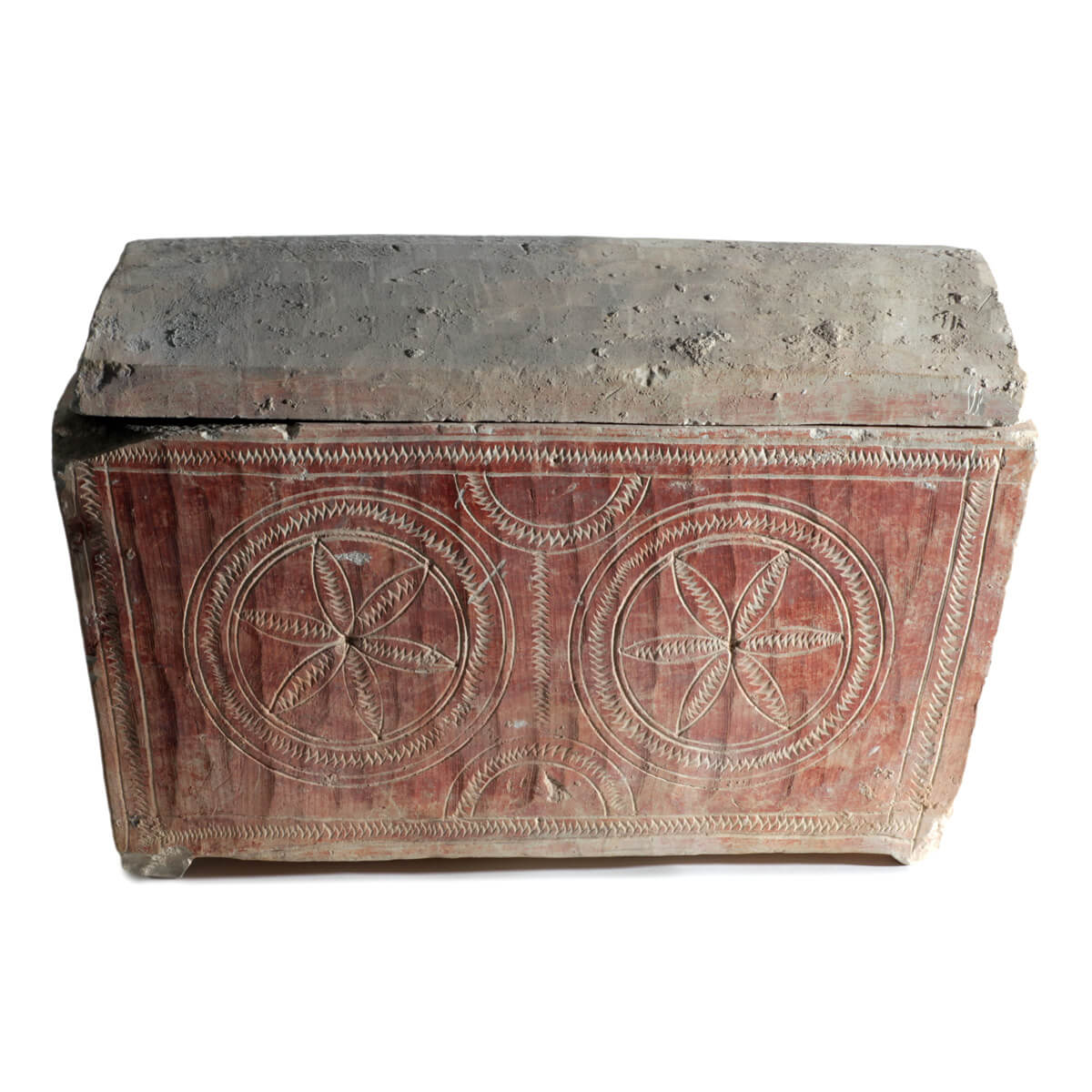 An ossuary with 2 rosettes, painted red. The first century AD. The Roman period.