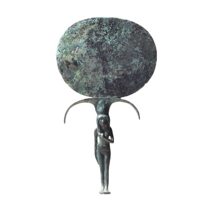 מראה מצרית (ראי) מברונזה, עם ידית בדמות אשה. יבוא קדום ממצרים. צפון עכו (הגן הבהאי). תקופת הברונזה המאוחרת