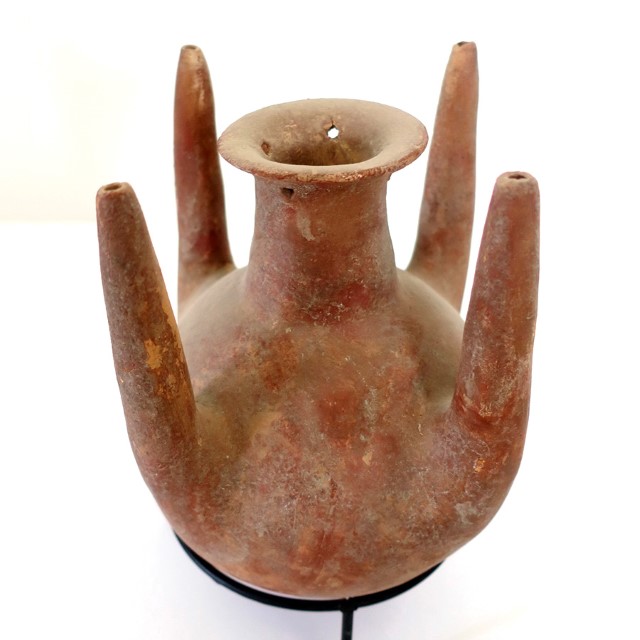 Jar, painted red, with 4 vertical “tubes” (“trunks”) and holes in the uper neck-rim. Early Bronze Age 1