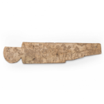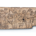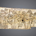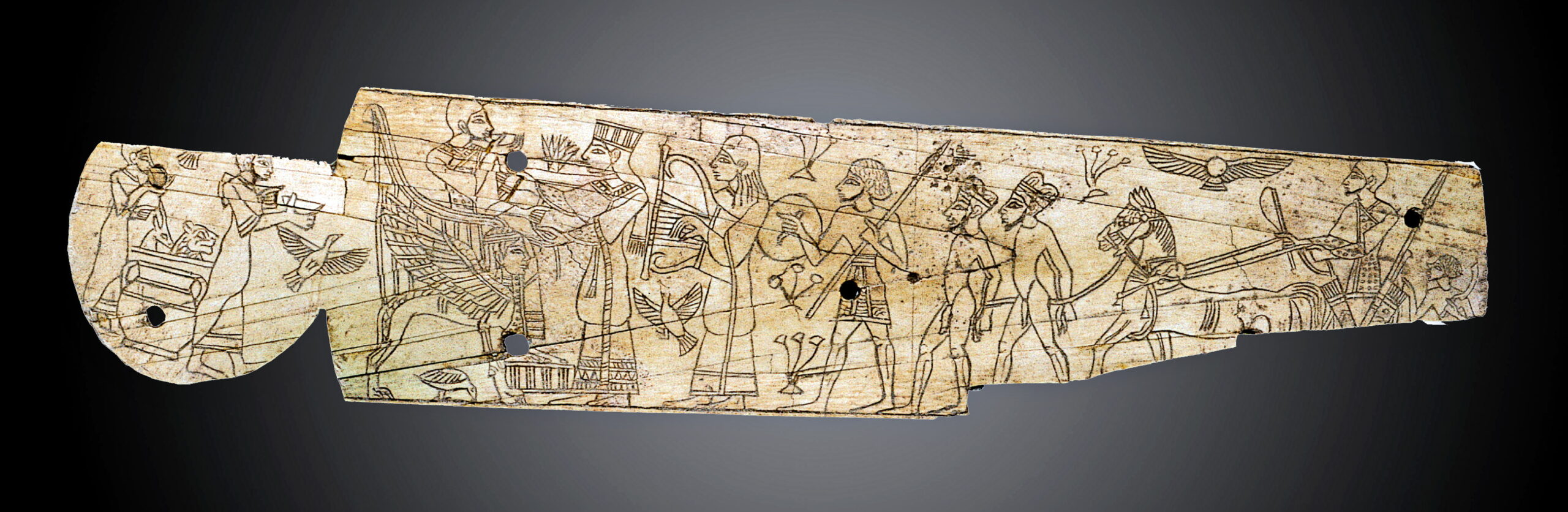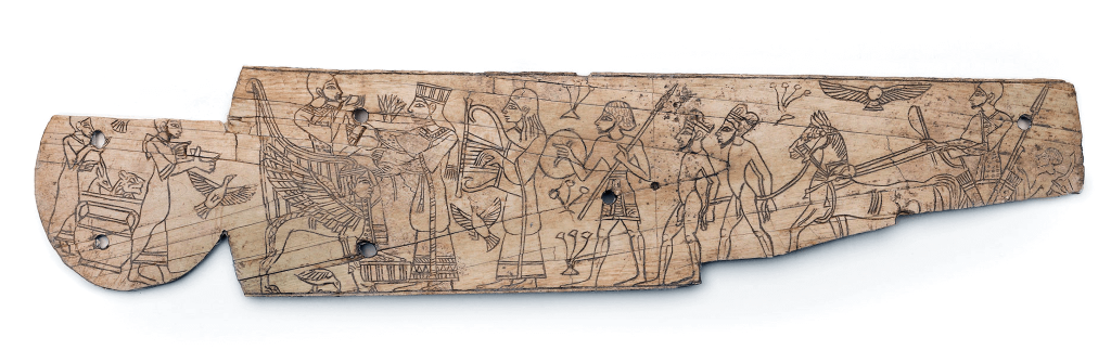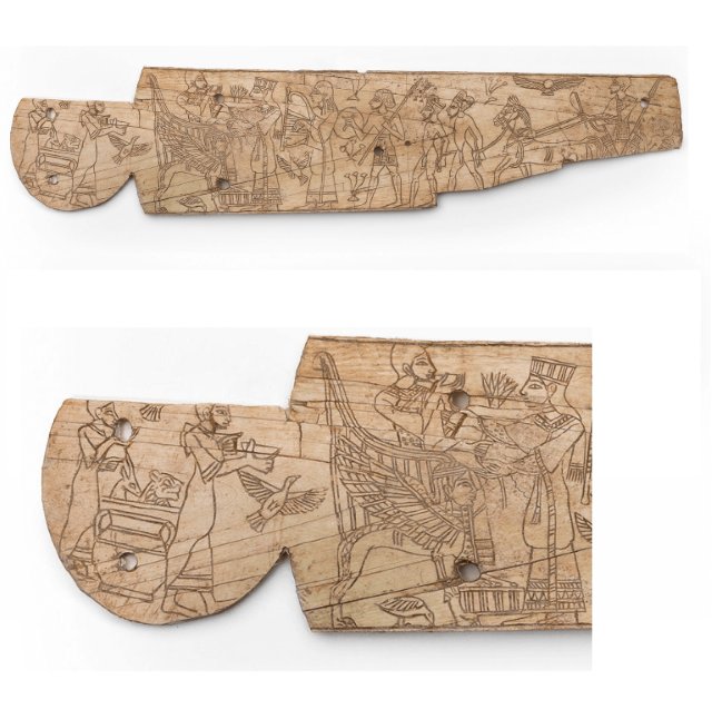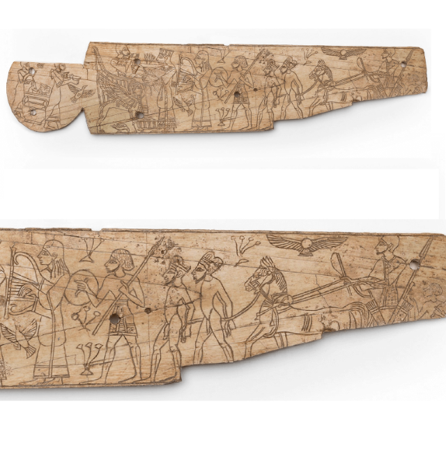 לוחית שנהב, שיבוץ של ידית כלי, עם סצנה של מלך יושב על כסא מלכותי, משתה, משלחת ושבויים, תל מגידו, תקופת הברונזה המאוחרת או תחילת תקופת הברזל 1