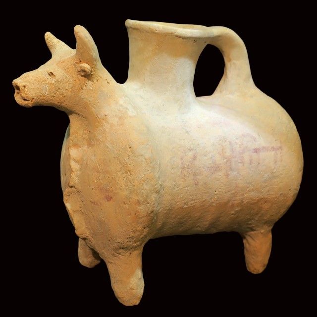 כלי זואומורפי בצורת פר, מעוטר באיילות (בצבע), תקופת הברונזה המאוחרת